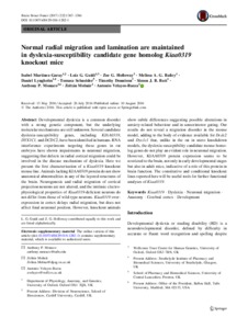 Martinez-Garay, Isabel, Guidi, Luiz G., Holloway, Zoe G., Bailey, Melissa A. G., Lyngholm, Daniel, Schneider, Tomasz, Donnison, Timothy, Butt, Simon J. B., Monaco, Anthony P. et al (2016) Normal radial migration and lamination are maintained in dyslexia-susceptibility candidate gene homolog Kiaa0319 knockout mice. Brain Structure and Function, 222 (3). pp. 1367-1384. ISSN 1863-2653