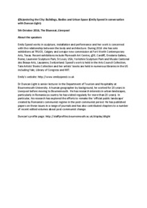 Speed, Emily and Light, Duncan (2016) Practising Place – (Dis)ordering the City: Buildings, Bodies and Urban Space. In: (Dis)ordering the City: Buildings, Bodies and Urban Space (Emily Speed in conversation with Duncan Light), 5 October 2016, The Bluecoat, Liverpool.