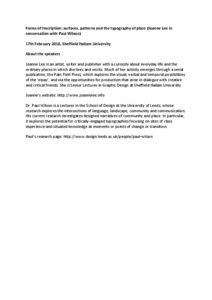 Lee, Joanne and Wilson, Paul (2016) Practising Place – Forms of Inscription: surfaces, patterns and the typography of place. In: Forms of Inscription: surfaces, patterns and the typography of place (Joanne Lee in conversation with Paul Wilson), 17 February 2016, Sheffield Hallam University.