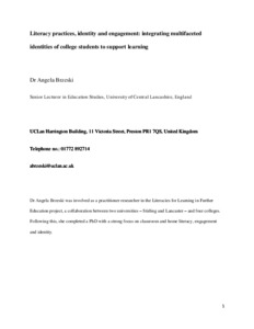 Brzeski, Angela (2017) Literacy practices, identity and engagement: integrating multifaceted identities of college students to support learning. Research in Post-Compulsory Education, 22 (3). pp. 391-408. ISSN 1359-6748
