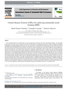 The overarching objective of social housing is to meet housing needs, particularly those of the vulnerable households – low and middle income earners. However, there is evidence to show that social housing is not adequately supported to achieve sustainable goals despite its significance for addressing the housing crisis. The aim of this study is to determine the Critical Success Factors (CSFs) for achieving Sustainable Social Housing (SSH) from economic, environmental and social perspectives for meeting housing needs. The document content analysis approach involving relevant literature resources was used for generating the success factors (SFs) for achieving SSH. Findings from this approach were refined before using them in preparing a questionnaire used to gather data from housing authorities (public) and private non-profit social housing organisations in England and they were asked to rank the criticality level of the identified success factors. The data gathered through the relevant documents and respondents were analysed respectively with NVivo and Statistical Package for Social Science (SPSS). Findings revealed some of the CSFs for achieving SSH for meeting housing needs as: adequate funding and provision, affordability, efficient economic planning, appropriate construction technology, environmental protection, use of environmental friendly materials, effective land use planning, appropriate design, security of lives and property, provision of social services and ensuring social cohesion. The paper recommends the use of efficient sustainable development (SD) strategies and legal and institutional frameworks for monitoring and evaluating the delivery of SSH. The Government must embark on effective housing programmes for ensuring adequate provision of social housing that is sustainable for meeting housing needs in the short and long-run. There is need for the Government to regularly provide financial supports to social housing providers and users for addressing the housing crisis.