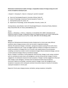Motivational and behavioural models of adjustment to chronic pain make different predictions about change processes, which can be tested in longitudinal analyses. We examined changes in motivation, coping and acceptance among 78 men with chronic haemophilia-related joint pain. Using cross-lagged regression analyses of changes from baseline to 6 months as predictors of changes from 6 to 12 months, with supplementary structural equation modelling, we tested two models in which motivational changes influence behavioural changes, and one in which behavioural changes influence motivational changes. Changes in motivation to self-manage pain influenced later changes in pain coping, consistent with the motivational model of pain self-management, and also influenced later changes in activity engagement, the behavioural component of pain acceptance. Changes in activity engagement influenced later changes in pain willingness, consistent with the behavioural model of pain acceptance. Based on the findings, a combined model of changes in pain self-management and acceptance is proposed, which could guide combined interventions based on theories of motivation, coping and acceptance in chronic pain. This study adds longitudinal evidence about sequential change processes; a test of the motivational model of pain self-management; and tests of behavioural versus motivational models of pain acceptance. [Abstract copyright: © 2017 European Pain Federation - EFIC®.]