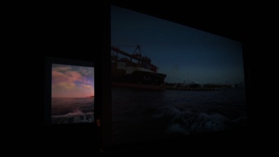 Two single shot, real-time films are displayed on opposite screens, depicting the journeys from East to West and vice versa with 8-channel audio communicating the Bosphorus as a space and place. The composition is comprised of binaural and hydrophone recordings of the strait, combining concrete and processed sounds to communicate both objective and subjective accounts of the crossings.