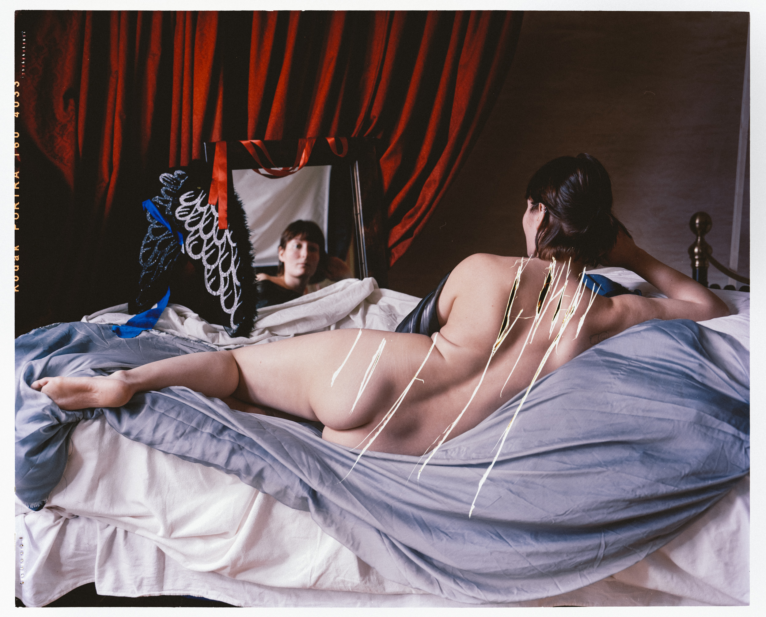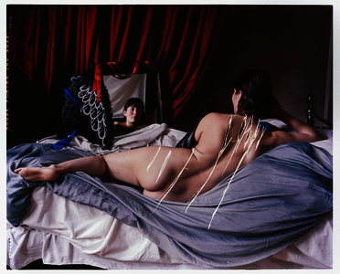 Taking this incident as its starting point After Mary Richardson, a collaboration with model Jen Morris, examines the hierarchies of image construction and representation. Modeled on Velázqeuz’s Rokeby Venus, the image seeks to collapse the roles played by photographer, subject, and spectator, while simultaneously questioning assumptions about gender and the gaze. Morris affected both the representation of the image and, on the anniversary of the ‘attack’, the materiality of the photograph itself – the subject inflicting the wounds on the personification of their own image. By literally marking the artwork as material representation, the problematic relationship between subject and object becomes manifest.