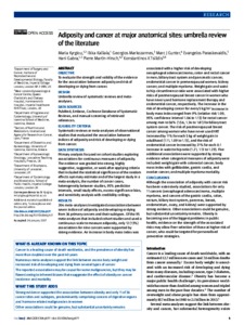Kyrgiou, Maria, Kalliala, IIkka, Markozannes, Georgios, Gunter, Marc J, Paraskevaidis, Evangelos, Gabra, Hani, Martin-Hirsch, Pierre and Tsilidis, Konstantinos K (2017) Adiposity and cancer at major anatomical sites: umbrella review of the literature. BMJ . j477. ISSN 0959-8138