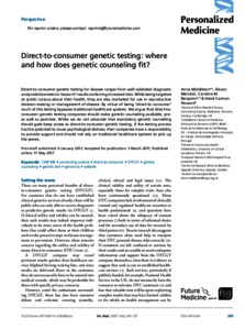 Middleton, Anna, Mendes, Alvaro, Benjamin, Caroline and Howard, Heidi Carmen (2017) Direct-to-consumer genetic testing: where and how does genetic counseling fit? Personalized Medicine, 14 (3). pp. 249-257. ISSN 1741-0541
