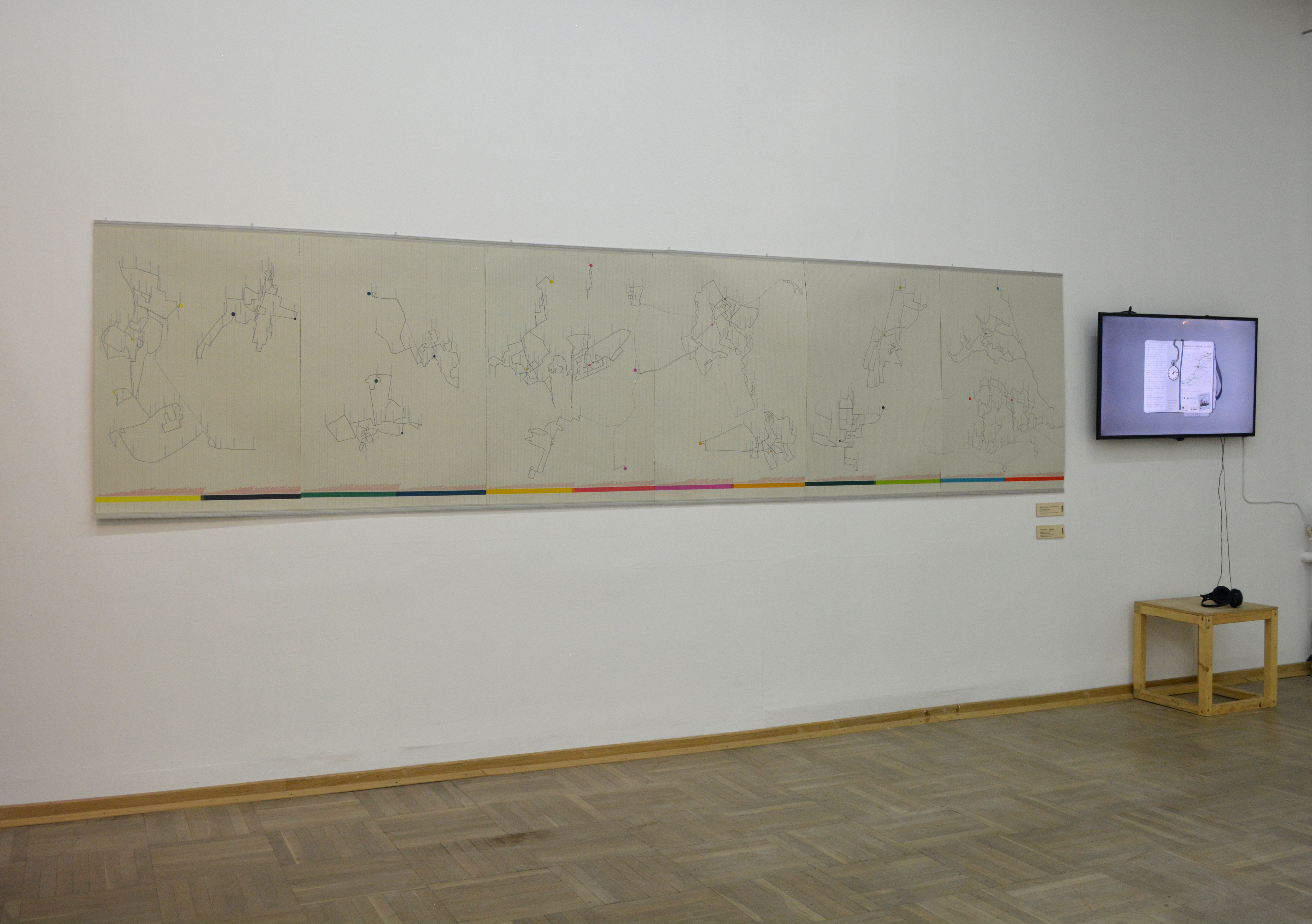 “50.06465,19.94498 to 45.441058,12.320845” (set of 6 prints) is a visual record of the artist’s movement through 12 urban locations where the field recordings took place for the “Kraków to Venice in 12 hours” project. The artist as an outsider is looking for key points within the urban space, but the city imposes its structure and creates a unique pattern for each of the drawings denoting the walks. The coloured dots on the map point to locations where the recordings took place on the hour. The printed record of latitude and longitude allows the viewer to discover exact locations where audio material was recorded.