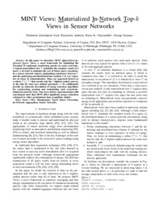 In this paper we introduce MINT (materialized in-network top-k) Views, a novel framework for optimizing the execution of continuous monitoring queries in sensor networks. A typical materialized view V maintains the complete results of a query Q in order to minimize the cost of future query executions. In a sensor network context, maintaining consistency between V and the underlying and distributed base relation R is very expensive in terms of communication. Thus, our approach focuses on a subset V(sube. V) that unveils only the k highest-ranked answers at the sink for some user defined parameter k. We additionally provide an elaborate description of energy-conscious algorithms for constructing, pruning and maintaining such recursively- defined in-network views. Our trace-driven experimentation with real datasets show that MINT offers significant energy reductions compared to other predominant data acquisition models.