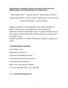 Resveratrol prevents social deficits in animal model of autism induced by valproic acid.