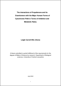 Carroll, Leigh (2010) The interactions of Propafenone and its enantiomers with the major human forms of cytochrome P450 in terms of inhibition and metabolic rates. Masters thesis, University of Central Lancashire.
