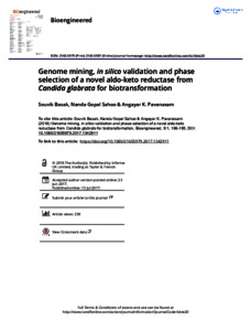 Basak, Souvik, Sahoo, Nanda Gopal and Pavanasam, Angayar (2018) Genome mining, in silico validation and phase selection of a novel aldo-keto reductase from Candida glabratea for biotransformation. Bioengineered, 9 (1). pp. 186-195. ISSN 2165-5979