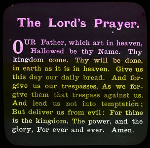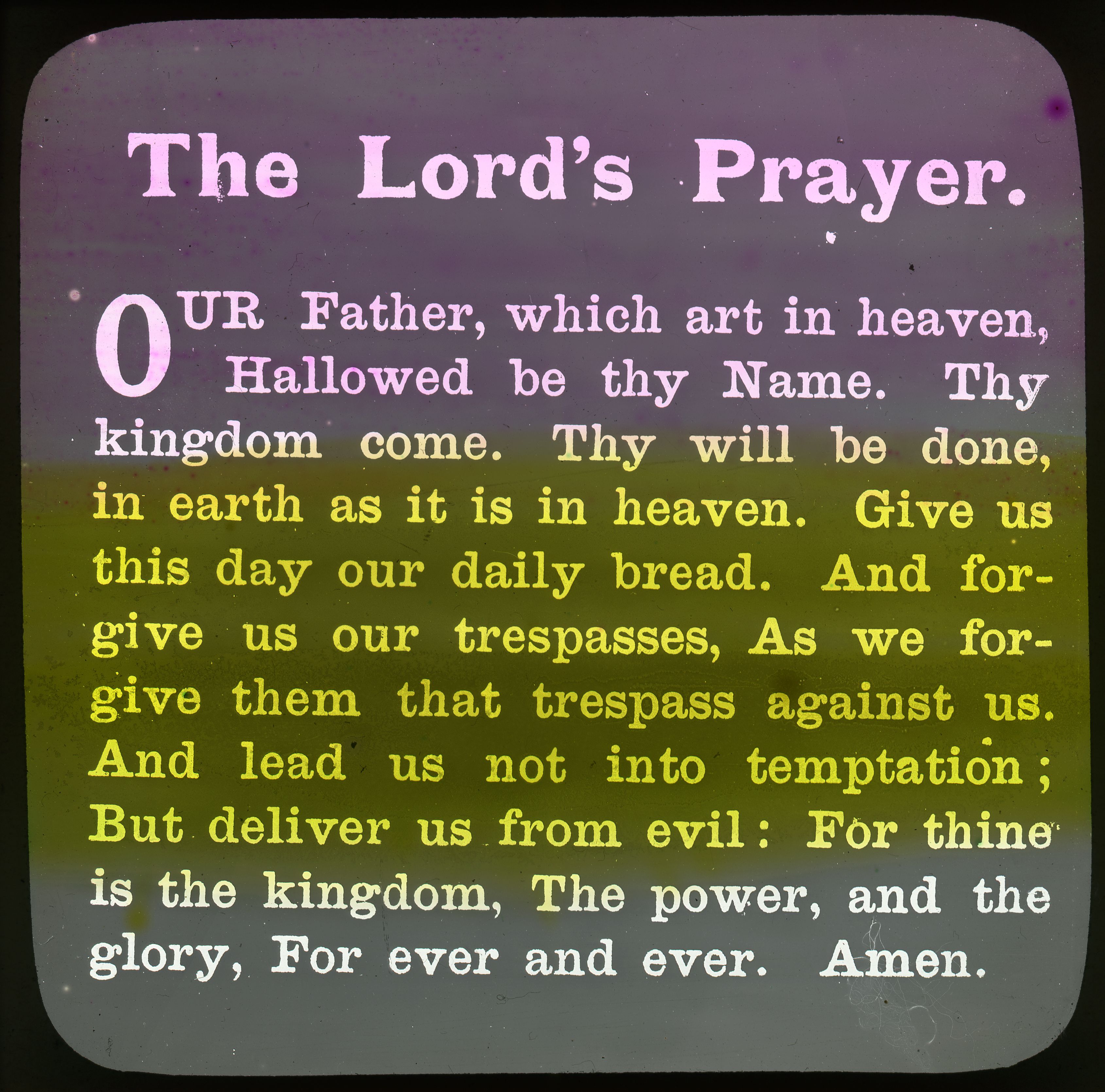 Our Father, which art in heaven, Hallowed be thy Name. Thy kingdom come. Thy will be done, in earth as it is in heaven. Give us this day our daily bread. And forgive us our trespasses, As we forgive them that trespass against us. And lead us not into temptation; But deliver us from evil: For thine is the kingdom, The power, and the glory, For ever and ever, Amen.