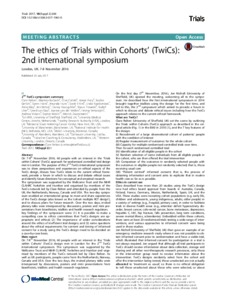 Relton, Clare, Burbach, Maarten, Collett, Clive, Flory, James, Gerlich, Sophie, Holm, Soren, Hunn, Amanda, Kim, Scott Y., Kwakkenbos, Linda et al (2017) The ethics of ‘Trials within Cohorts’ (TwiCs): 2nd international symposium - London, UK. 7-8 November 2016. Trials, 18 (S2). p. 244. ISSN 1745-6215