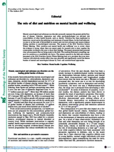 Mental, neurological and substance-use disorders presently represent the greatest global burden of disease. Likewise, depression and other psychopathologies are elevated risk comorbidities of other health hazards, such as obesity. Nutrition has been implicated in behaviour, mood and in the pathology and treatment of mental illness. In this brief editorial, we aim to set the scale of the problem in context and overview advances and recent evidence linking nutrition to psychological outcomes. The purpose of the 2016 Nutrition Society Winter Meeting, 'Diet, nutrition and mental health and wellbeing' was to review where the evidence is strong, where there are unmet needs for research and to draw together the communities working in this area to share their findings. The papers presented demonstrated clear advancements that are being made in this field. The meeting illustrated compelling support for nutrition as a modifiable risk factor. The present research in the field and evidence presented at the 2016 Nutrition Society Winter Meeting lead us to postulate that even interventions with relatively modest effect sizes may plausibly and significantly curtail the disease burden of mental and neurological disease by food- and nutrient-based approaches.