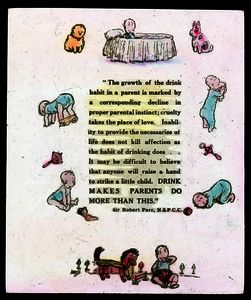 "The growth of the drink habit in a parent is marked by a corresponding decline in proper parental instinct; cruelty takes place of love. Inability to provide the necessaries of life does kill affection as the habit of drinking does .. It may be difficult to belive that anyone will raise a hand to strike a little child. DRINK MAKES PARENTS DO MORE THAN THIS."