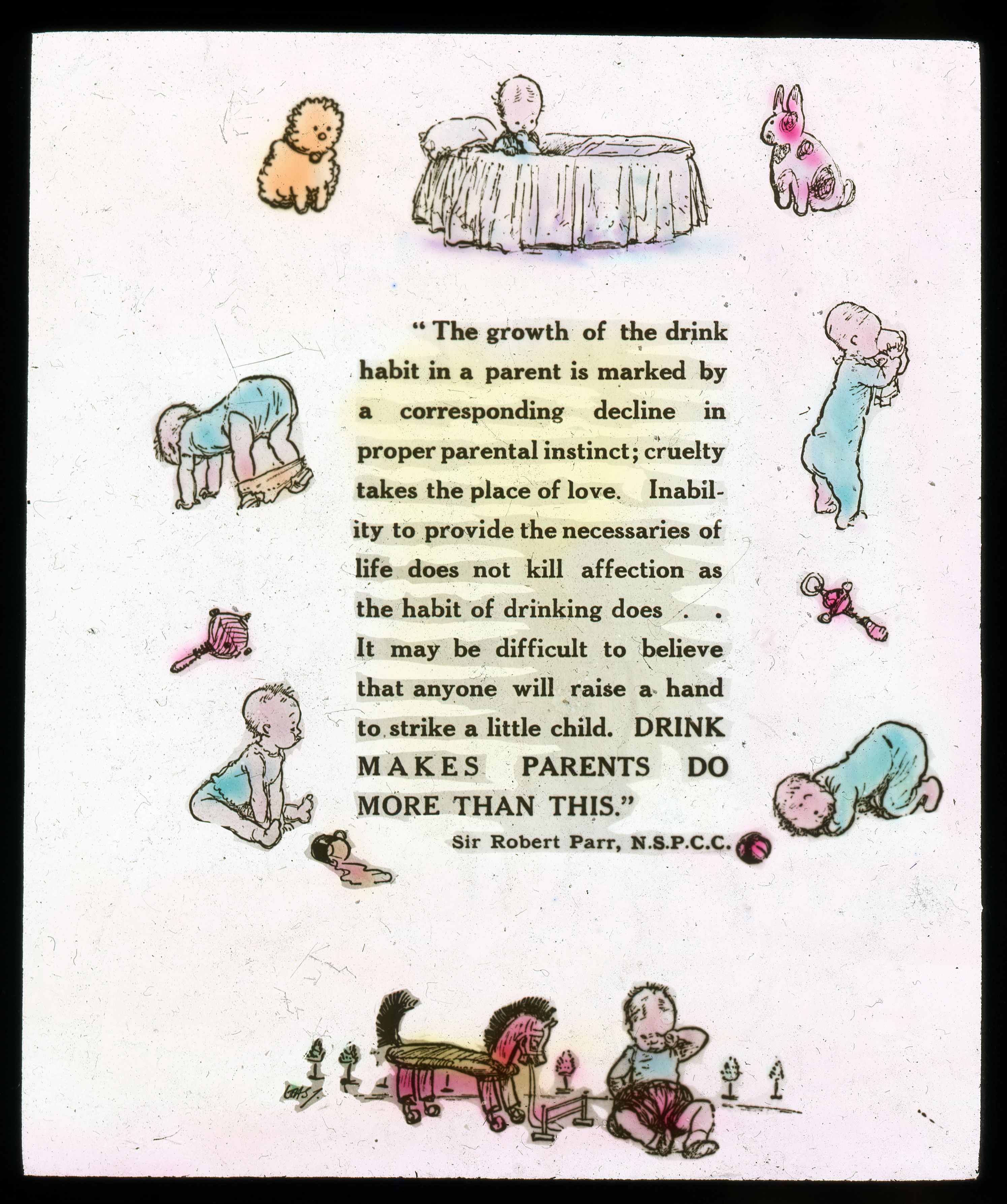 This lantern slide shows the view of Sir Robert Parr of the N.S.P.C.C on the influence of alcohol on the parental capabilities of drinkers.