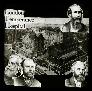 This home-made lantern slide commemorates the founding of the London Temperance Hospital in 1873. It was the first hospital not to use alcohol as part of treatment, which was common practice.