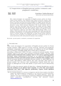 This study investigates L2 acquisition of English present perfect by Greek Cypriot Greek speakers. One hundred Greek Cypriot university students took part in the study, the first part of which examined the sensitivity to grammatical norms (a passage correction task, based on Odlin et al. 2006), and the other part was focused on the production of English present perfect (elicitation of natural discourse, essays about personal experience). The results showed that L2 learners used more non-target tense forms (present simple and past simple) than the target present perfect in typical contexts, which is due to transfer from L1 Cypriot Greek (CG). The data only partially supports the Inherent Lexical Aspect Hypothesis (Andersen and Shirai 1996; Bardovi-Harlig 1999), as L2 learners used perfective and past tense morphology with both punctual-telic predicates (achievements or accomplishments) and atelic or durative predicates (state or activity), though their production of target present perfect improves with more years of exposure to L2 English and there is a decrease in the use of stative and activity verbs with perfective and past tense marking.