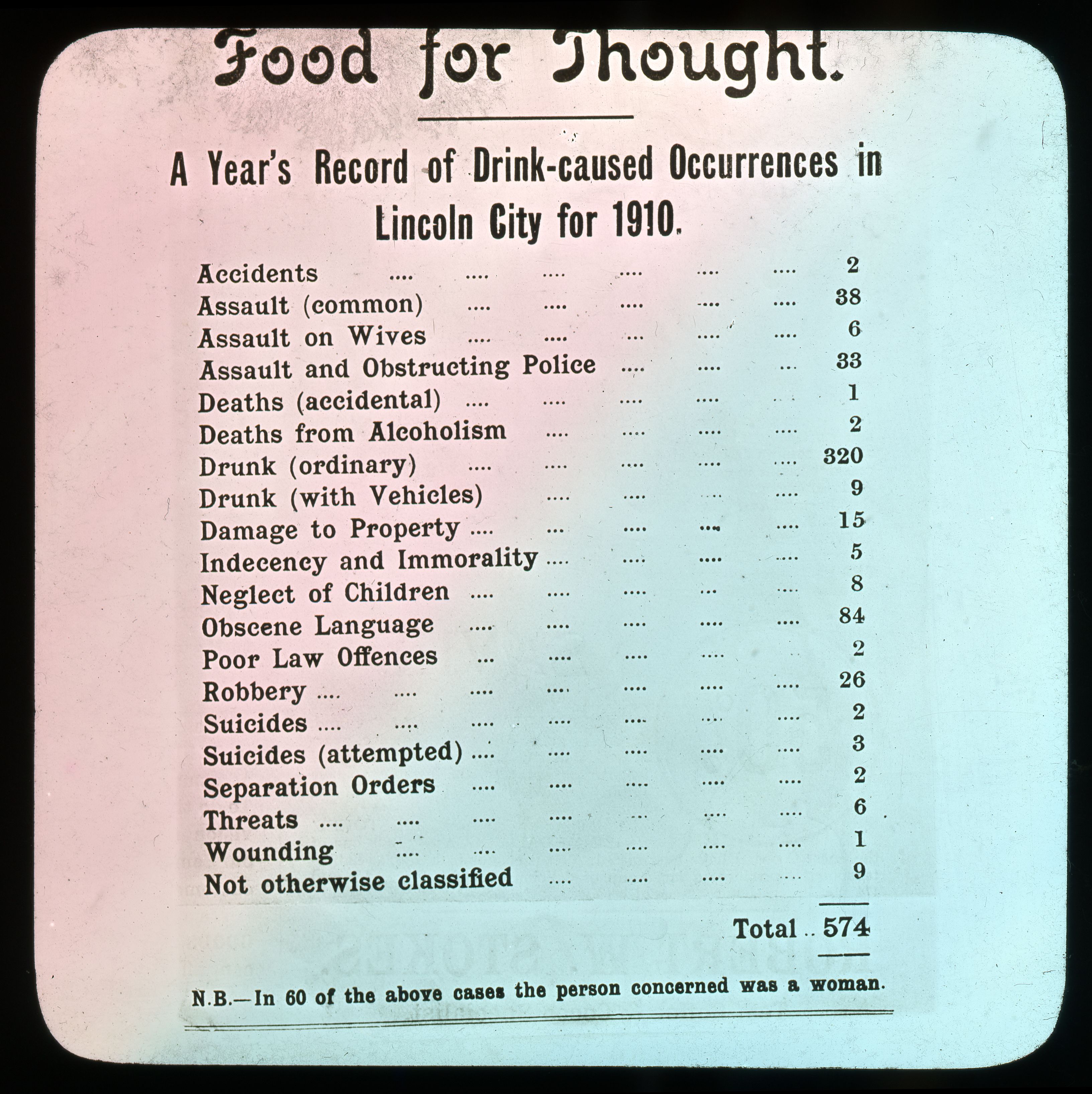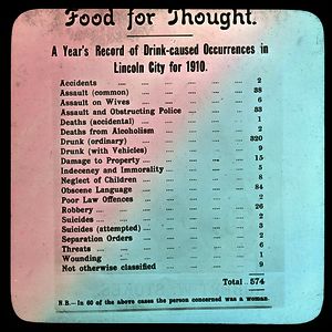 Often statistics were left to speak for themselves. Here the statistics for a single year (1910) of drink related occurrences in Lincoln are meant to shock the viewer.