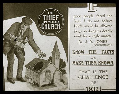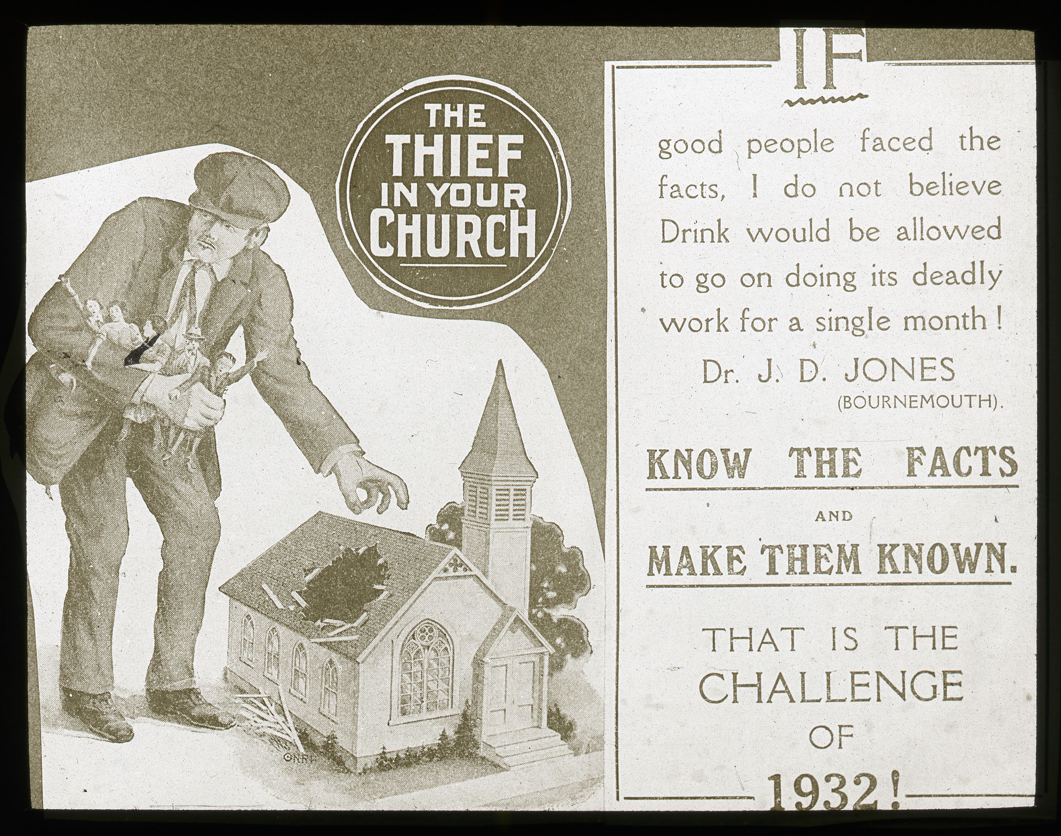 This lantern slide from 1932 seeks to encourage churches of all denominations to take temperance seriously. Many were committed to temperance, and the Church of England formed its own Temperance Society (1862-1969).