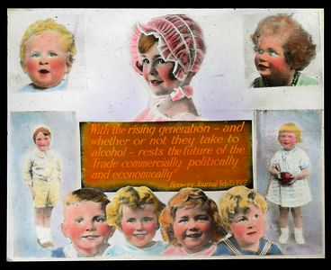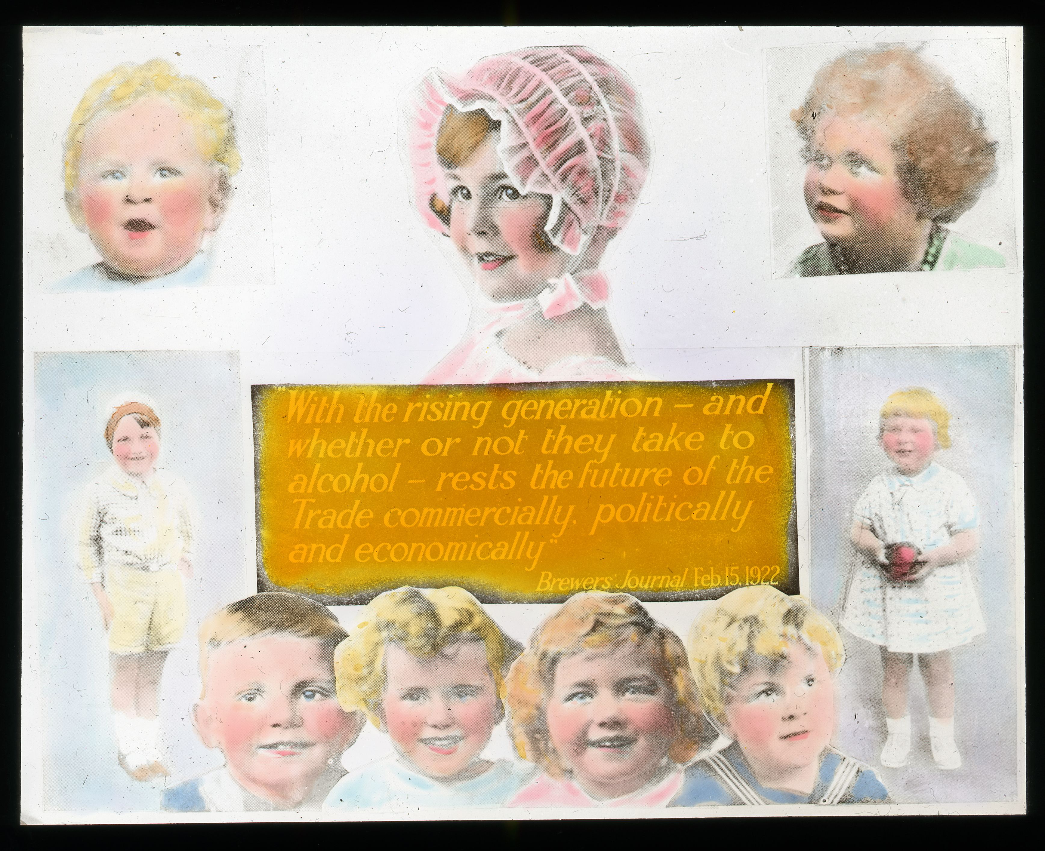 Temperance campaigners monitored statements by the drinks industry, and often used them, as in this slide from the 1920s, to draw attention to their targeting of vulnerable groups as customers. The images of the innocent children are at odds with the brewing companies’ statement.