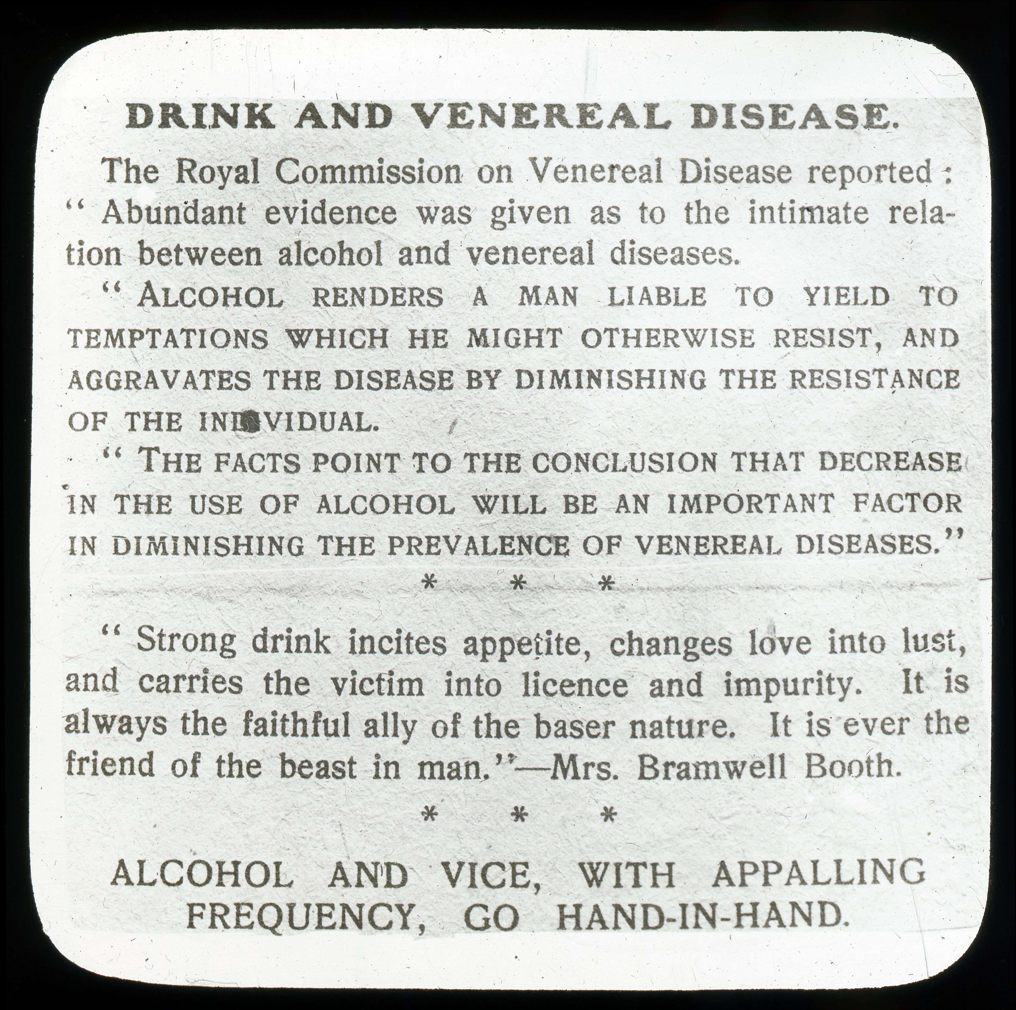 "THE FACTS POINT TO THE CONCLUSION THAT DECREASE IN THE USE OF ALCOHOL WILL BE AN IMPORTANT FACTOR IN DIMINISHING THE PREVALENCE OF VENERAL DISEASES."