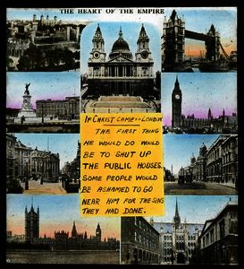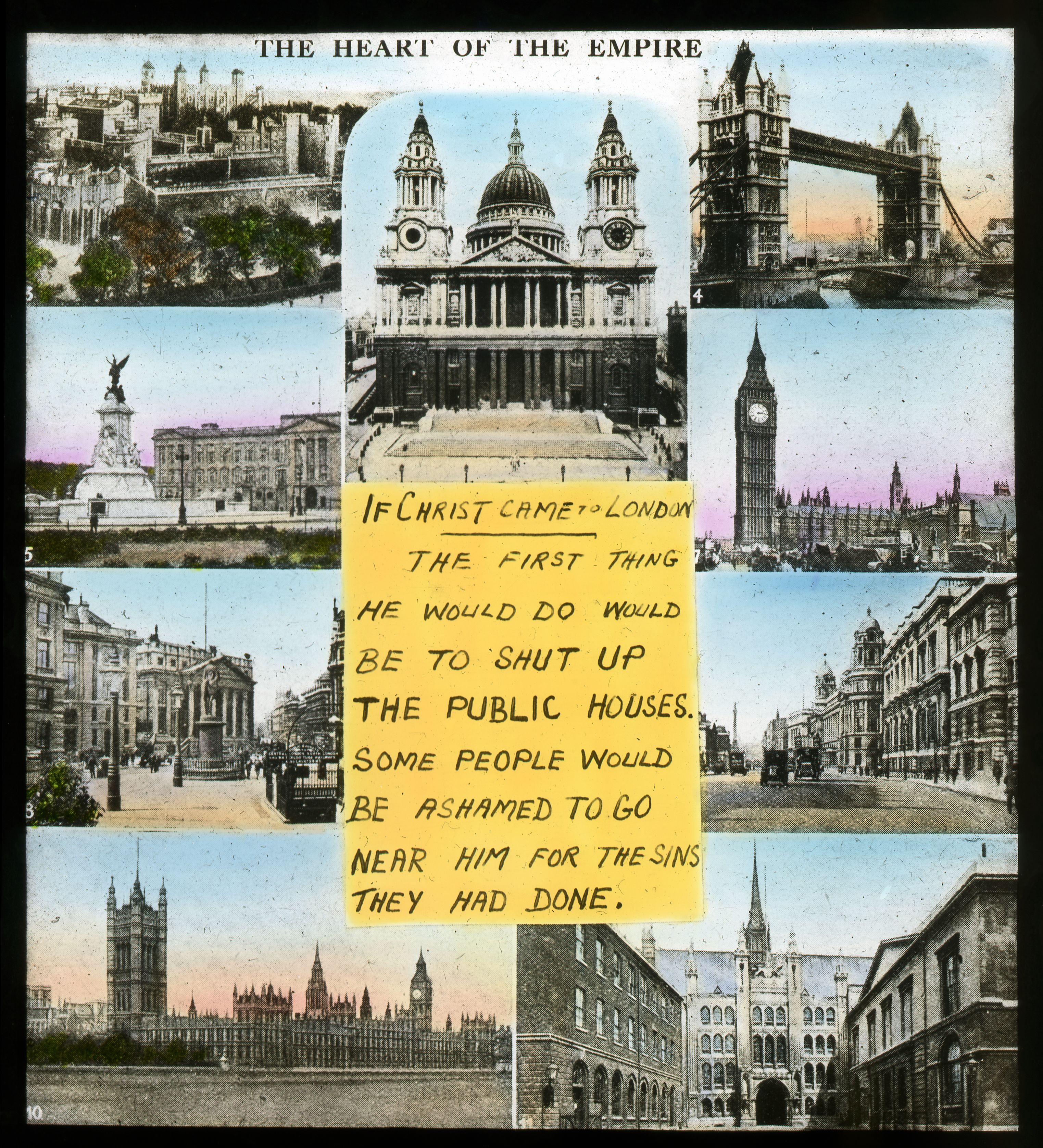 This is an interesting example of a commercially-produced slide being customised by an amateur, who wrote the pointed message in the centre. Temperance was often liked with explicitly Christian commitment.