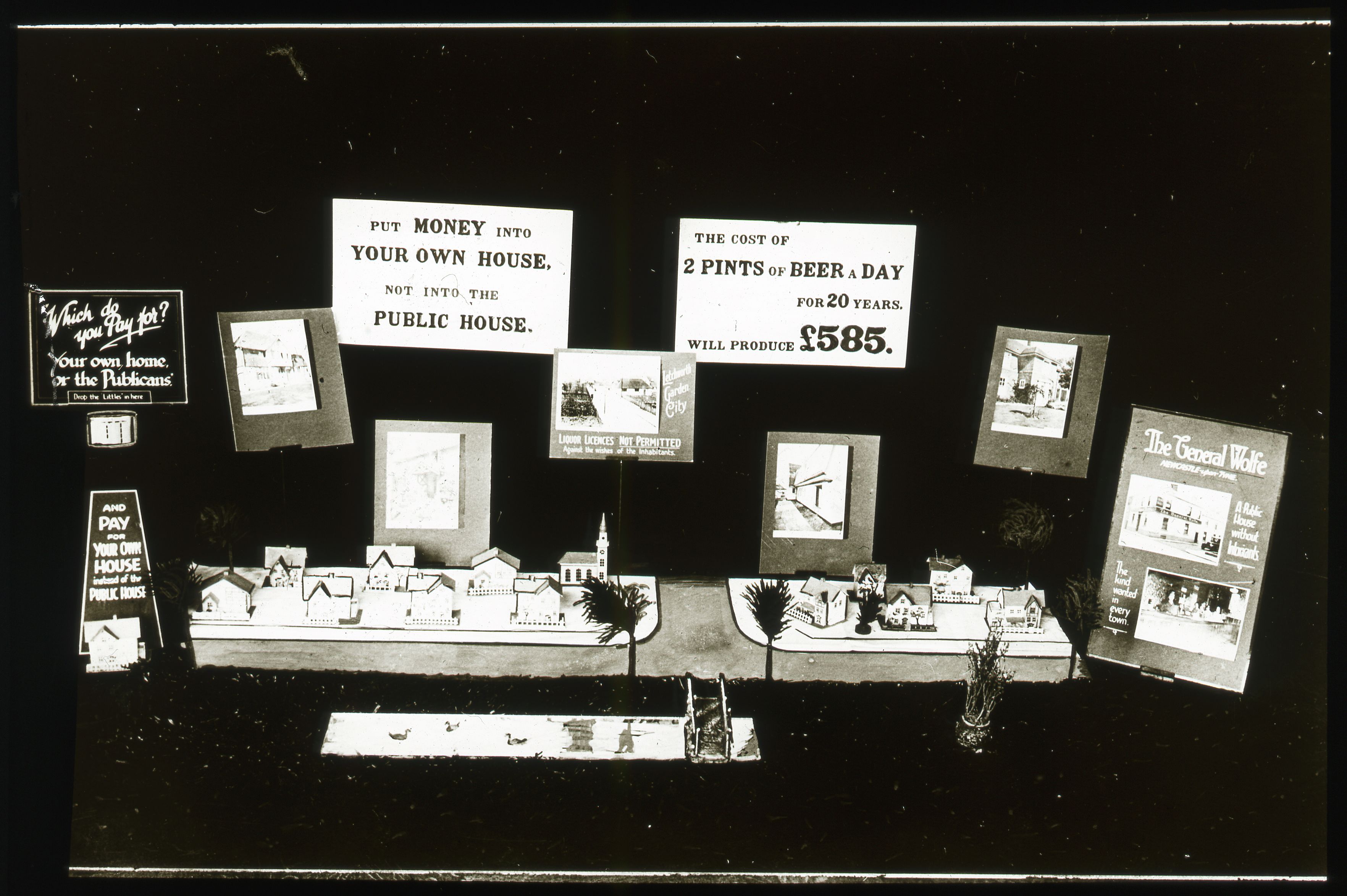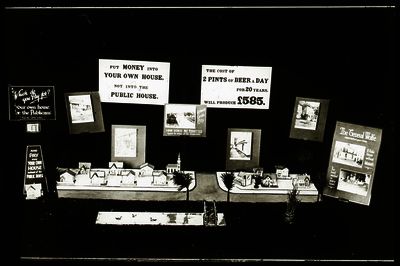 This display illustrates the common motto of temperance campaigners, that people should put their money into their own house rather than the public house.