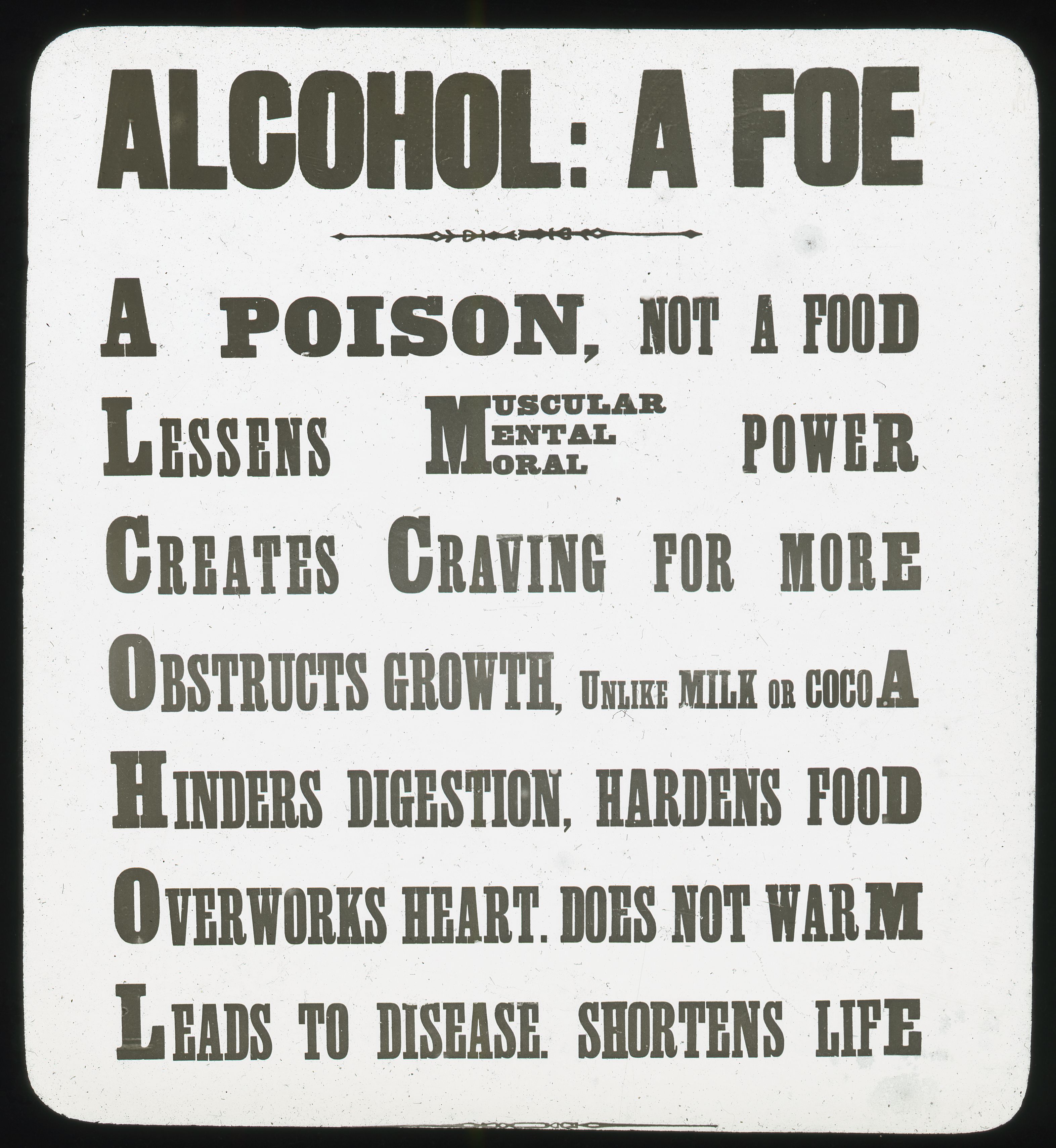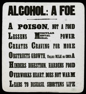 This lantern slide focuses on the health issues associated with alcohol consumption, making use of initial letters to form an acrostic, a popular device.