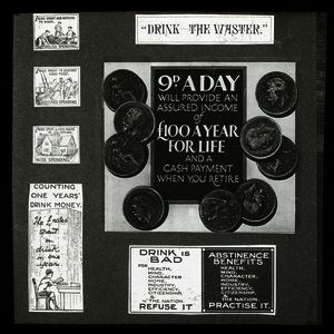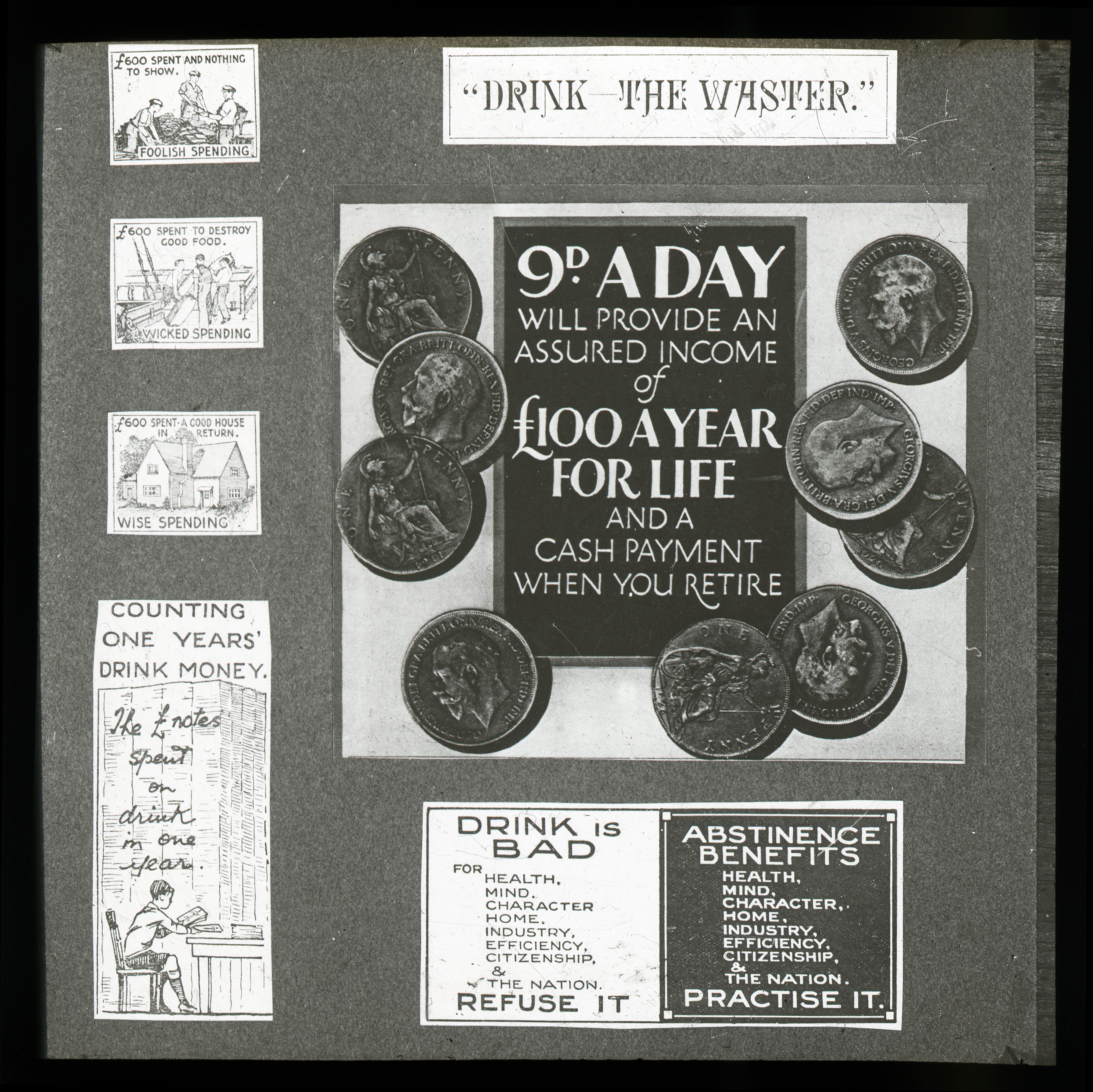 The concept of saving rather than drinking was a common feature of temperance ‘friendly’ organisations; the benefits illustrated on this lantern slide include an income of £100 a year and a cash payment on retirement.