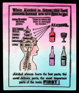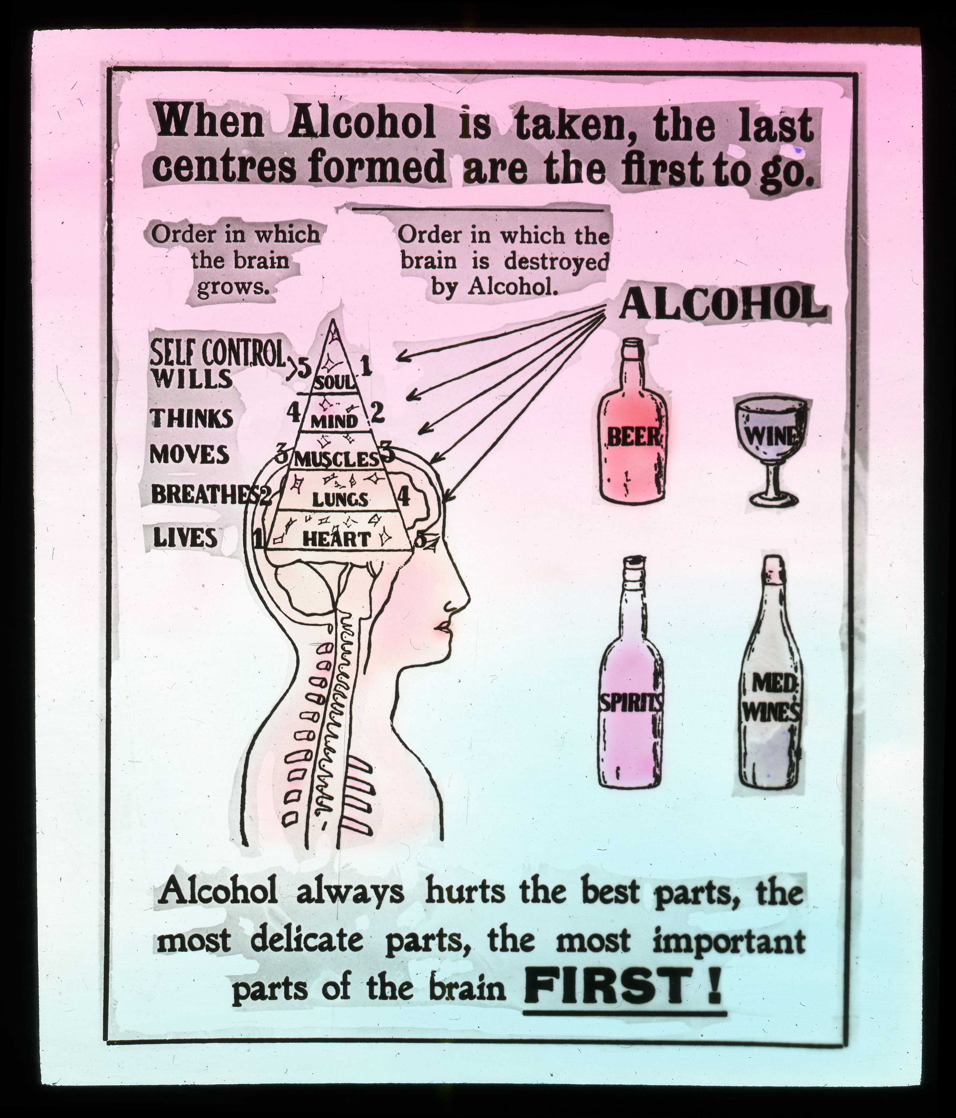 Exposing the effects of alcohol on the brain was a near constant in temperance campaigning; this lantern slide shows the order in which drink would poison the body.