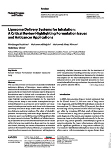Rudokas, Mindaugas, Najlah, M, Albed Alhnan, Mohamed and Elhissi, A (2016) Liposome Delivery Systems for Inhalation: A Critical Review Highlighting Formulation Issues and Anticancer Applications [Review]. Medical Principles and Practice, 25 (S2). pp. 60-72. ISSN 1011-7571