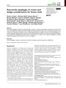 Cohen, D.L, Roffe, C, Beavan, J, Blackett, B, Fairfield, C.A, Hamdy, S, Havard, D, McFarlane, M, McLauglin, C et al (2016) Post-stroke dysphagia: A review and design considerations for future trials. International Journal of Stroke, 11 (4). pp. 399-411. ISSN 1747-4930