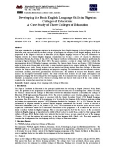 Tom-lawyer, Oris Oritsebemigho (2016) Developing the basic english language skills in Nigerian colleges of education: A case study of three colleges of education. International Journal of Applied Linguistics and English Literature, 5 (3). pp. 99-112. ISSN 2200-3592