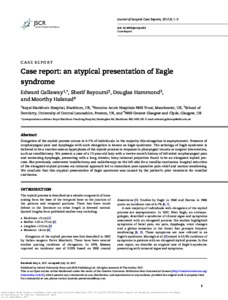 Gallaway, Edward, Bayoumi, Sherif, Hammond, Douglas and Halsnad, Moorthy (2017) Case report: an atypical presentation of Eagle syndrome. Journal of Surgical Case Reports, 2017 (8). rjx152.