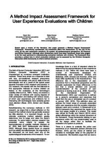 Based upon a review of the literature, this paper presents a Method Impact Assessment Framework. Theoretically synthesized, the framework offers five dimensions: (1) the role of the child, (2) the user experience construct, (3) system, (4) epistemological perspective, (5) Practical and Ethical Concerns. Although other dimensions could have been construed, these were judged to be the most pertinent to understanding evaluation methods with children. The framework thus provides a critical lens in which evaluation methods can be assessed by the Children Computer Interaction (CCI) Community to inform method selection.