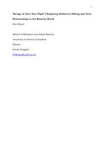 Bacon, Kate Victoria (2012) Beings in their own right? Exploring Children and young people's sibling and twin relationships in the Minority World. Children's Geographies, 10 (3). pp. 307-319. ISSN 1473-3285