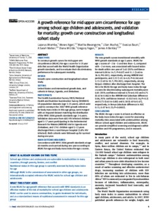Mramba, Lazarus, Ngari, Moses, Mwangome, Martha, Muchai, Lilian, Bauni, Evasius, Walker, A Sarah, Gibb, Diana, Fegan, Gregory and Berkley, James (2017) A growth reference for mid upper arm circumference for age among school age children and adolescents, and validation or mortality: growth curve construction and longitudinal cohortstudy. British Medical Journal (BMJ), 358 (3423). ISSN 0959-8138