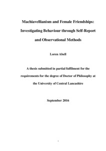 Abell, Loren (2016) Machiavellianism and female friendships: Investigating behaviour through self-report and observational methods. Doctoral thesis, University of Central Lancashire.