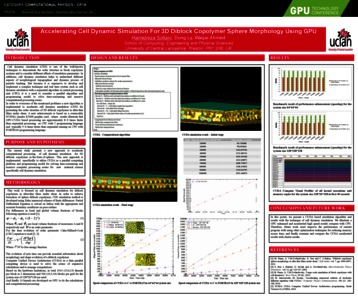 Soltani, Hamidreza, Ly, Dung and Ahmed, Waqar orcid iconORCID: 0000-0003-4152-5172 (2015) Accelerating cell dynamic dynamic simulation for 3D diblock copolymer sphere morphology using GPU. In: GPU Technology Conference, 17-20 March 2015, San Jose, USA. (Unpublished)