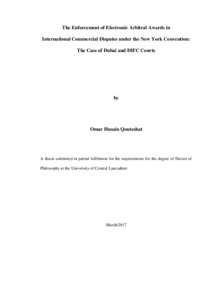 Qouteshat, Omar Husain jamil (2017) The enforcement of electronic arbitral awards in international commercial disputes under the New York Convention: The case of Dubai and DIFC courts. Doctoral thesis, University of Central Lancashire.