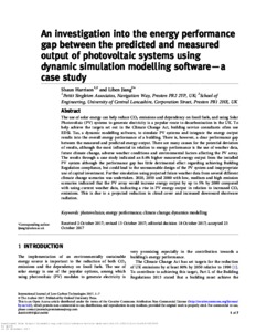 The use of solar energy can help reduce CO₂ emissions and dependency on fossil fuels, and using Solar Photovoltaic (PV) systems to generate electricity is a popular route to decarbonisation in the UK. To help achieve the targets set out in the Climate Change Act, building service consultants often use EDSL Tas, a dynamic modelling software, to simulate PV systems and integrate the energy output results into the overall energy performance of a building. There is, however, a clear performance gap between the measured and predicted energy output. There are many causes for the potential deviation