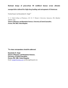 Rational design of polysorbate 80 stabilized human serum albumin nanoparticles tailored for high drug loading and entrapment of Irinotecan.