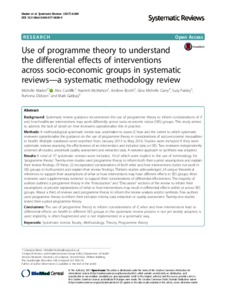 Methods: A methodological systematic review was undertaken to assess if, how and the extent to which systematic reviewers operationalise the guidance on the use of programme theory in considerations of socio-economic inequalities in health. Multiple databases were searched from January 2013 to May 2016. Studies were included if they were systematic reviews assessing the effectiveness of an intervention and included data on SES. Two reviewers independently screened all studies, undertook quality assessment and extracted data. A narrative approach to synthesis was adopted. Results: A total of 37 systematic reviews were included, 10 of which were explicit in the use of terminology for ‘programme theory’. Twenty-nine studies used programme theory to inform both their a priori assumptions and explain their review findings. Of these, 22 incorporated considerations of both what and how interventions do/do not work in SES groups to both predict and explain their review findings. Thirteen studies acknowledged 24 unique theoretical references to support their assumptions of what or how interventions may have different effects in SES groups. Most reviewers used supplementary evidence to support their considerations of differential effectiveness. The majority of authors outlined a programme theory in the “Introduction” and “Discussion” sections of the review to inform their assumptions or provide explanations of what or how interventions may result in differential effects within or across SES groups. About a third of reviews used programme theory to inform the review analysis and/or synthesis. Few authors used programme theory to inform their inclusion criteria, data extraction or quality assessment. Twenty-one studies tested their a priori programme theory. Conclusions: The use of programme theory to inform considerations of if, what and how interventions lead to differential effects on health in different SES groups in the systematic review process is not yet widely adopted, is used implicitly, is often fragmented and is not implemented in a systematic way.