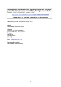 What role do animals have in a future tourism world – in the year 2070? Contemplating over meat and fish delights on restaurant menus, hunting for sport and leisure purposes, and the presence of safaris and zoos have aspects in common, significantly animals are central to their existence and tourists are key consumers. Importantly, these pastimes, social activates, and leisurely pursuits have their ancestral roots that pre-date modern society. Humans have long been associated with eating meat, hunting animals and holding animals in some form of captivity for recreation and education. Distinctively, this paper explores animal cloning and how it could support the extension and existence of these tourism pursuits in the future, focusing on the year 2070. The paper applies a scenario planning approach as its methodological approach to research. The study contributes innovative and original concepts to the future tourism landscape. Through rigorous analysis and discussions in the fields of animal cloning and its relationship with tourism and tourists in potential future settings, a gap in the future market is presented. This research paper presents three scenarios in which cloning could support future tourism markets, Food tourism 2070: A Japanese restaurant perspective, Sport Hunting and tourism 2070: Designated hunting reserves in South Africa; and Safari-zoo tourism 2070: Into the Wild, cloning for education & conservation in the U.S.A. The paper offers interesting research for the futures field and tourism studies, offering scholars and industry with novel concepts for debating.