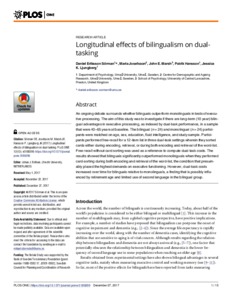 An ongoing debate surrounds whether bilinguals outperform monolinguals in tests of executive processing. The aim of this study was to investigate if there are long-term (10 year) bilingual advantages in executive processing, as indexed by dual-task performance, in a sample that were 40-65 years at baseline. The bilingual (n = 24) and monolingual (n = 24) participants were matched on age, sex, education, fluid intelligence, and study sample. Participants performed free-recall for a 12-item list in three dual-task settings wherein they sorted cards either during encoding, retrieval, or during both encoding and retrieval of the word-list. Free recall without card sorting was used as a reference to compute dual-task costs. The results showed that bilinguals significantly outperformed monolinguals when they performed card-sorting during both encoding and retrieval of the word-list, the condition that presumably placed the highest demands on executive functioning. However, dual-task costs increased over time for bilinguals relative to monolinguals, a finding that is possibly influenced by retirement age and limited use of second language in the bilingual group.