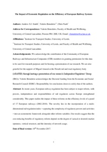 In recent years, European railway regulation has been subject to major reform, with powers, independence and responsibilities of rail regulators across Europe strengthened considerably. This paper studies the impact of these reforms on the efficiency levels of a panel of 17 European railways (2002-2010). The novelty lies in the incorporation of a multi-dimensional rail regulation index – capturing the complexity of regulatory powers and activities – into an econometric framework alongside other reform variables. Our results suggest that the cost-reducing benefits of regulatory reform depend on the degree of (actual or desired) market openness, vertical structure, and the intensity of network usage.