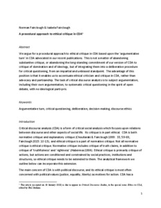 We argue for a procedural approach to ethical critique in CDA based upon the ‘argumentative turn’ in CDA advocated in our recent publications. This is not a matter of abandoning substantive critique, or abandoning the long-standing commitment of our version of CDA to critique of domination and of ideology, but of integrating them into a deliberative procedure for critical questioning, from an impartial and unbiased standpoint. The advantage of this position is that it enables us to accentuate ethical criticism and critique in CDA, rather than advocacy and partisanship. The task of critical discourse analysts is to subject argumentation, including their own argumentation, to systematic critical questioning in the spirit of open debate, with no ideological parti-pris.