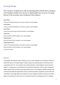 The transition of adolescents with juvenile idiopathic arthritis or epilepsy from paediatric health-care services to adult health-care services: A scoping review of the literature and a synthesis of the evidence.