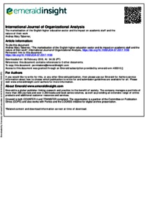Taberner, Andrea M (2018) The marketisation of the English higher education sector and its impact on academic staff and the nature of their work. International Journal of Organizational Analysis, 26 (1). pp. 129-152. ISSN 1934-8835
